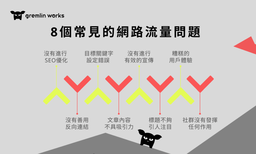 如果您的網站流量未達到預期,雖然您認為已經採取了正確的行動,但還是有可能隱藏著一些錯誤。以下是 Gremlin Works 為您整理的8個網站沒有達到預期的原因,幫助您調整並改善網站流量:
