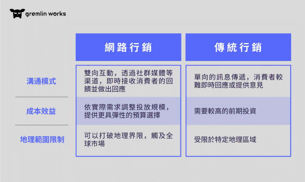 所謂的傳統行銷包含電視、廣播、報紙、雜誌等傳統媒體,而網路行銷則運用我們上述提到的數位工具和網路來接觸目標客群。而這兩種行銷方式有主要有三個關鍵的差異: