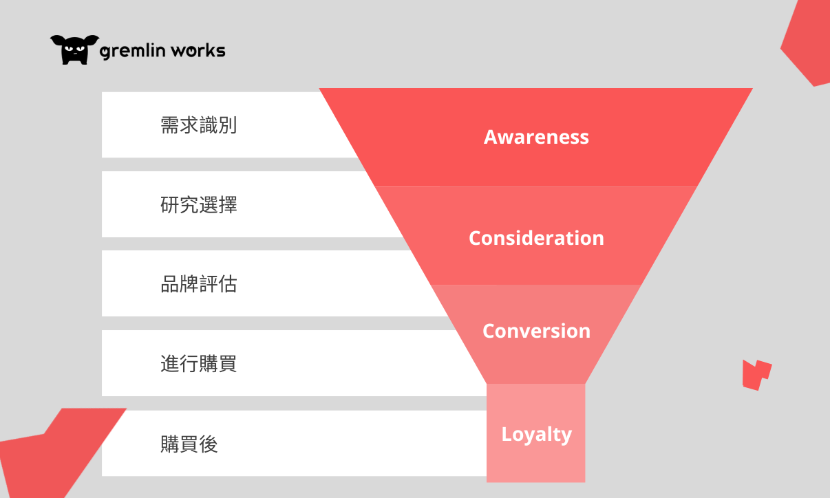 這5個階段大致相當於潛在客戶對您品牌的認知水平-認知、考慮、轉換、忠誠度與擁護,如下圖所示: