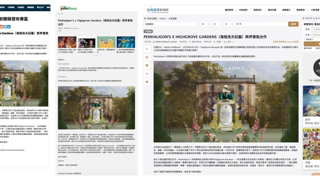 在新品上市期間,我們協助 Penhaligon's 撰寫並發佈公關新聞稿,提升品牌新品在台灣市場的知名度。