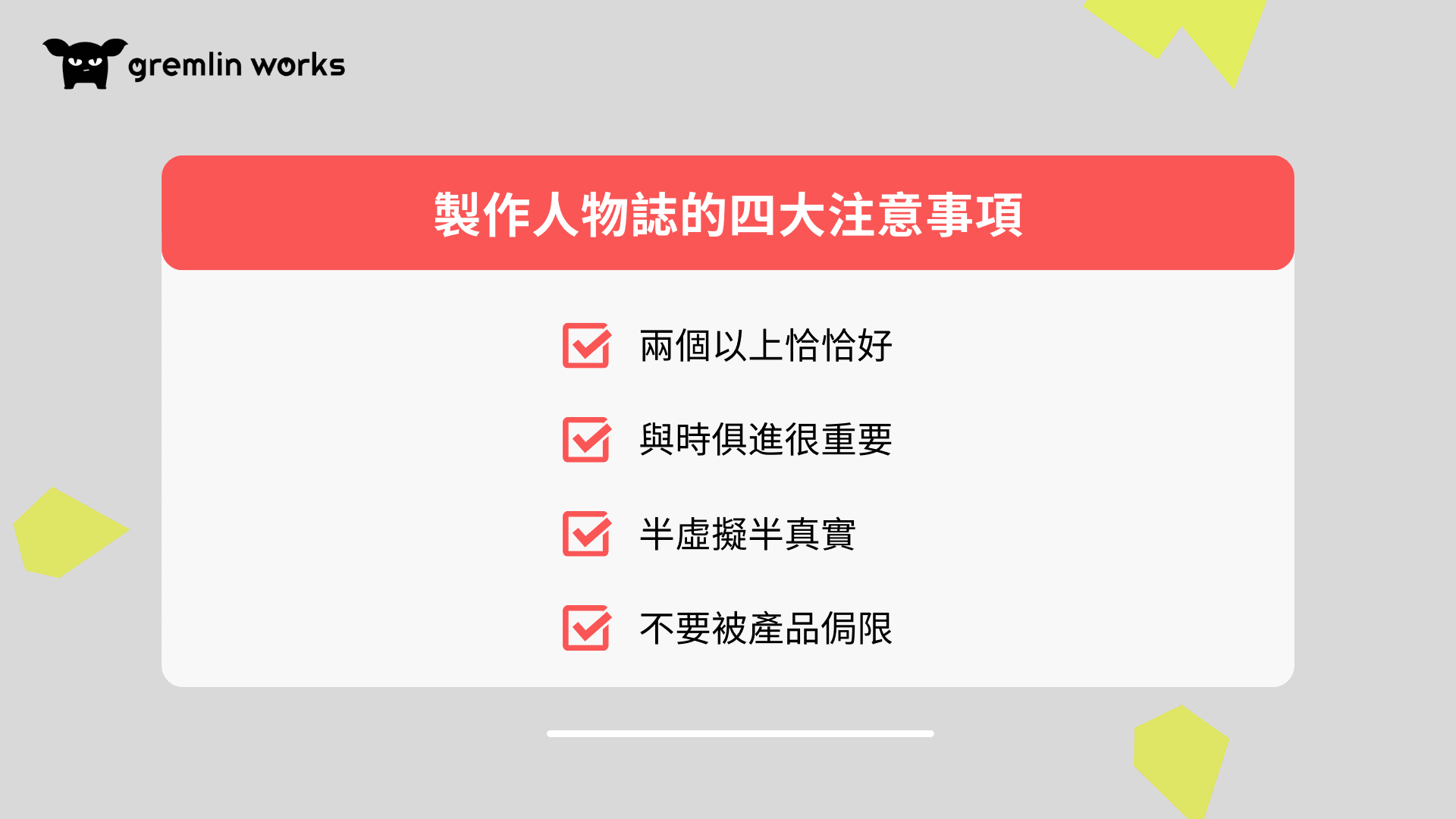 不僅是在創建人物誌時需要耗費心力,在創建前,可能需要一些事前準備,以避免思考方向和現實狀況相差太多;在創建後,也需要定期回顧、檢視和更新。