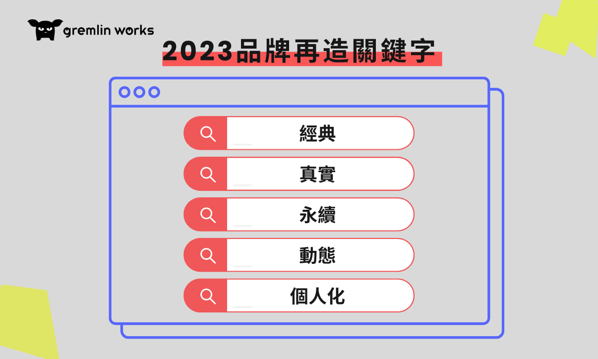 綜觀2023年大大小小的品牌再造案例,可以發現「經典」、「真實」、「永續」、「動態」及「個人化」,是品牌再造的五大關鍵字。一個成功的品牌必須緊跟市場趨勢和消費者不斷變化的興趣,才能使品牌再造事半功倍,成為驅動企業前進的催化劑!