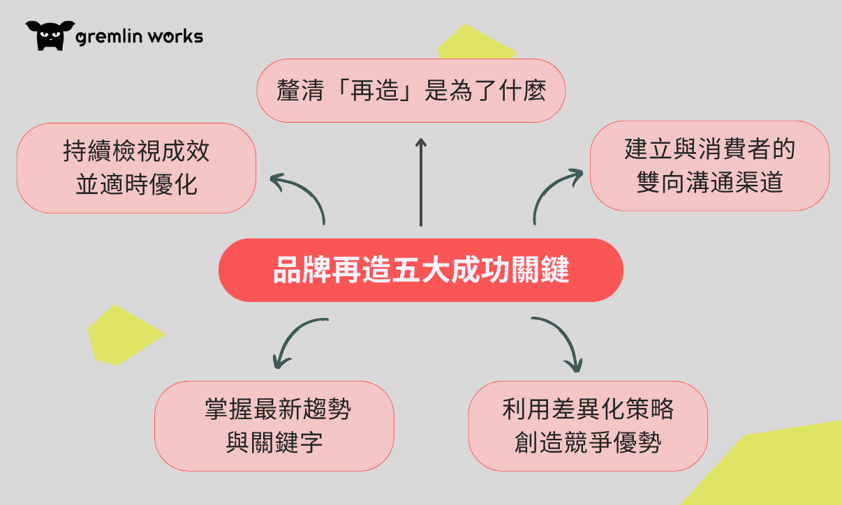 藉由實施有效的再造策略,你的品牌不僅能夠提升品牌形象,還能鞏固並加強與消費者的連結,最終達到提升市場份額和盈利能力的目標。