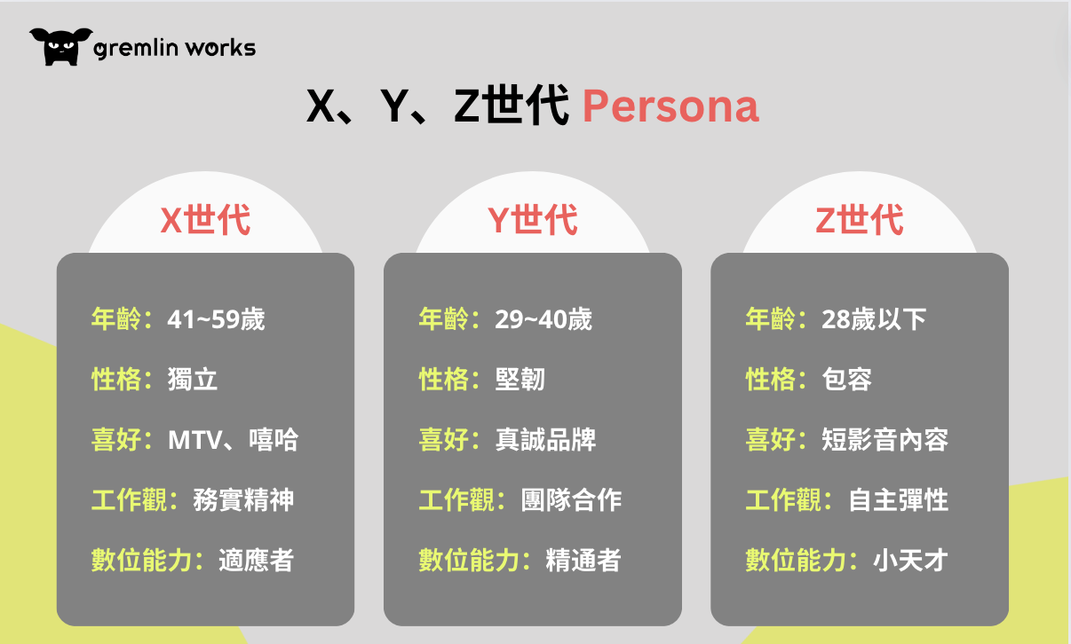 接下來,我們剖析三個世代的特質和價值觀,製作一份簡易人物誌(Persona),以抓住世代區別的關鍵因素。
