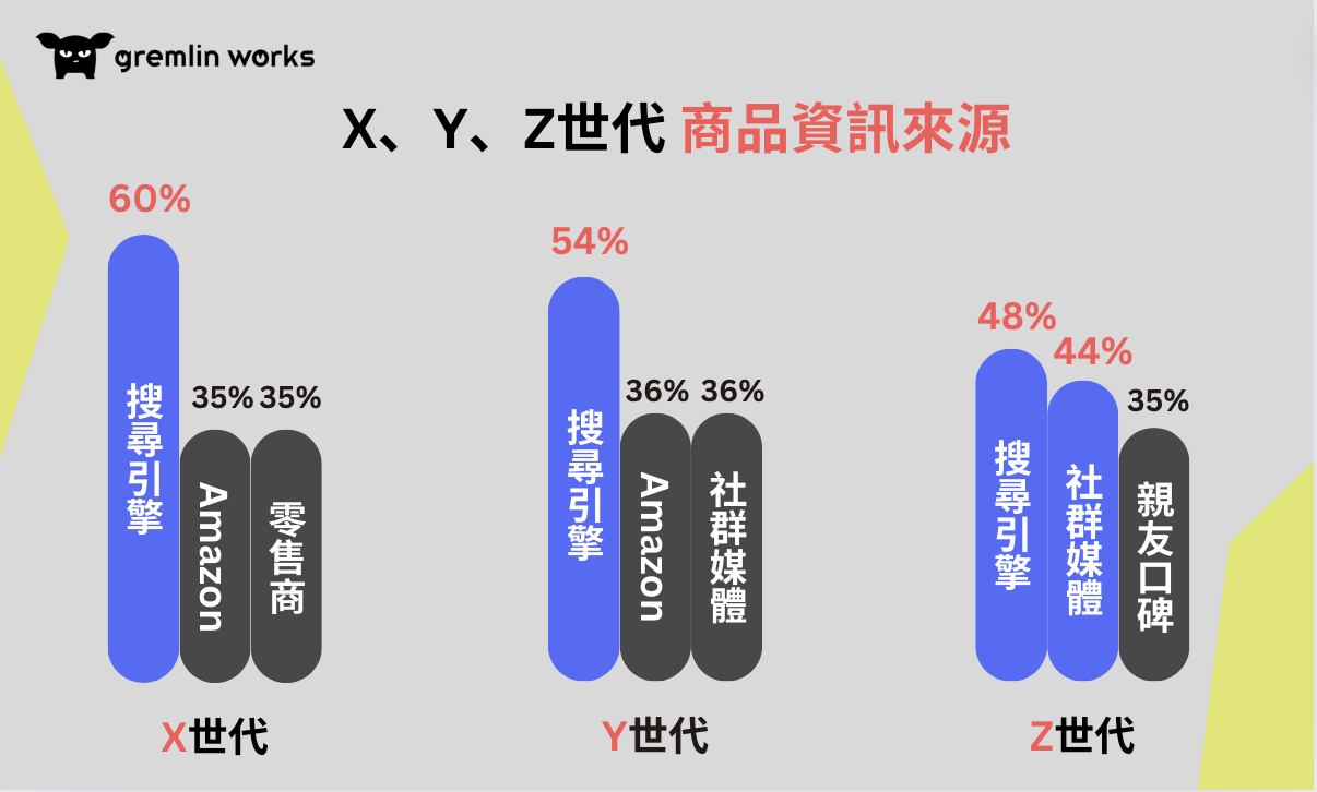 X世代在搜尋商品資訊時,有近六成(60%)消費者以搜尋引擎首要方式,其次分別為Amazon網站(35%)與零售商網站(35%)。